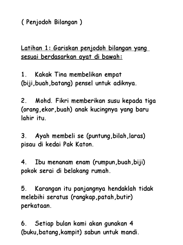 Gariskan penjodoh bilangan yang sesuai berdasarkan ayat di bawah. Dicatat oleh Rohaini Bt Mat Zin di 1002 PG. E-melkan IniBlogThisKongsi ke TwitterKongsi ke FacebookKongsi ke Pinterest.